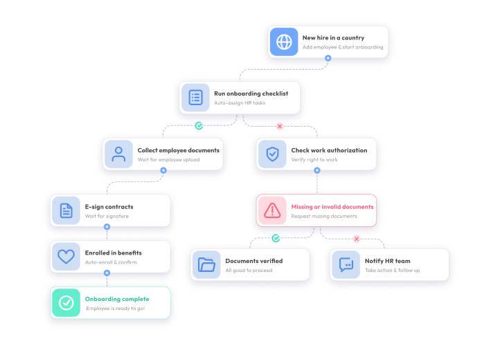 From contracts and minimum wage to terminations and local regulations, we manage it all across the globe. Stay compliant throughout the entire employee lifecycle with continuous monitoring of regulatory changes, ensuring you're always up to date.
