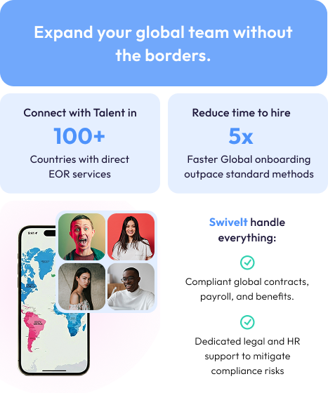 Swivelt combines intuitive technology with real human expertise to help you hire faster, stay compliant, and expand into new markets with confidence